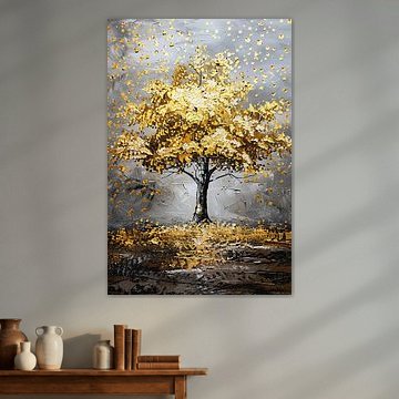 Baum mit goldenen Blättern vor abstraktem Hintergrund