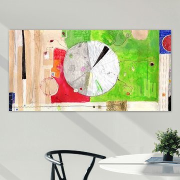 Abstracte kunstwerken, collages, gedichten aan de muur