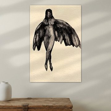 Als ich zum ersten Mal die Fotos von Helmut Newton sah, war ich sofort fasziniert. Zu dieser Zeit studierte ich auch die Struktur des menschlichen Körpers und begann, die Modelle auf seinen Fotos nachzuzeichnen. Jahre später entdeckte ich die kleine Druckpresse des Openpress-Projekts, mit der auch die Putten von 'Voler' gedruckt wurden. Ich begann, mit den alten Zeichnungen nach Helmut Newton und mit Reliefdruck zu experimentieren. Die weibliche Figur ist ein Tetraprint. Bei einigen Versionen folgte noch ein Reliefdruck von Federn über den gezeichneten Flügeln.