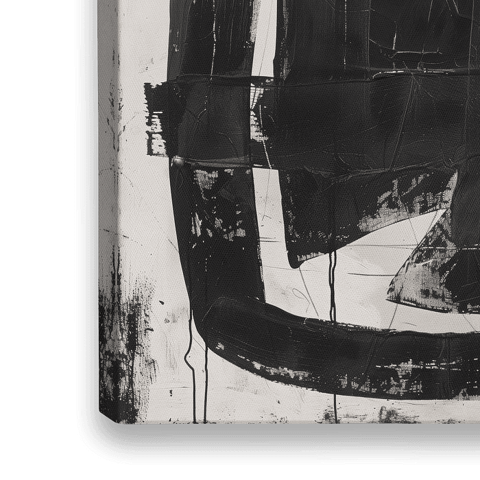 Kräftige schwarze Pinselstriche überschneiden und überlagern sich auf einem strahlend weißen Hintergrund und schaffen eine abstrakte Komposition. Die dynamischen Linien vermitteln Bewegung und Tiefe mit einer rohen, ausdrucksstarken Qualität.