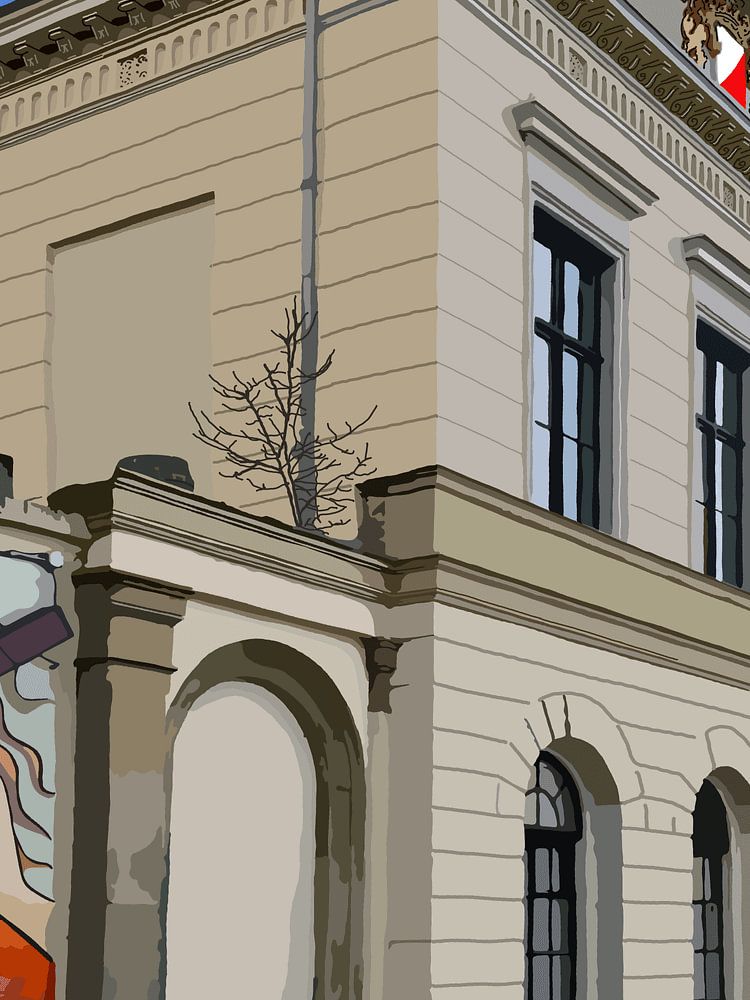 Hinter dem Laternenpfahl taucht ein unerwartetes Element auf: ein Graffiti in Form eines großen, offenen Mundes, dessen Farbe überwiegend rot ist. Dieses expressive, fast schreiende Bild verleiht der Komposition eine rohe, urbane Dynamik und steht in starkem Kontrast zum monumentalen Charakter des Gebäudes.