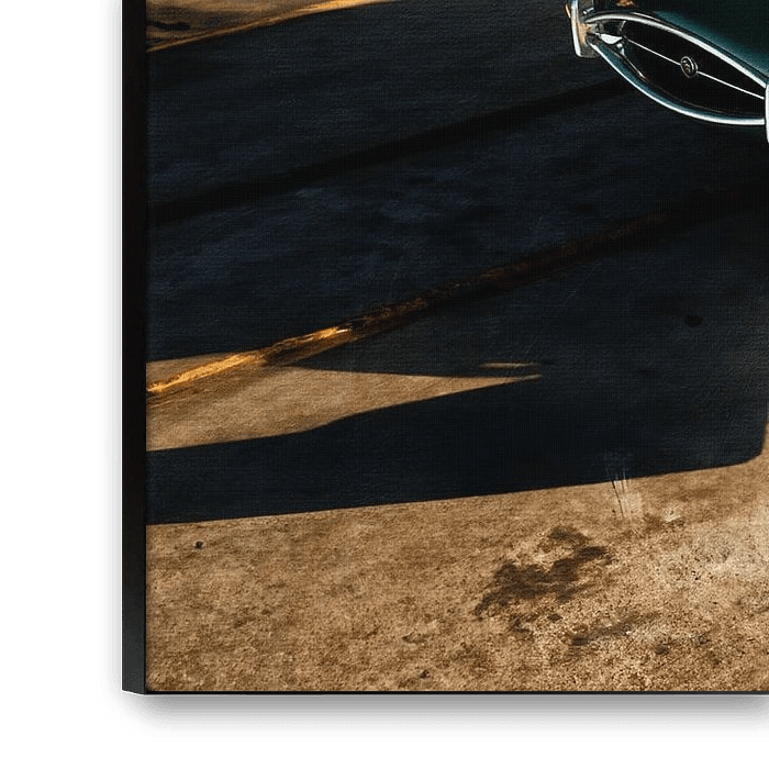 Die Werkstatt mit ihrem fleckigen Betonboden, den verblichenen gelben Linien und den verstreuten Werkzeugen erzählt eine Geschichte von Arbeit und Restaurierung - ein Ort, an dem Schönheit bewahrt und wiedergeboren wird. Der rot-weiße Stützbalken, der Feuerlöscher und die gewellten Wände verleihen der Szene Textur und Authentizität und verankern sie in der Realität. Der wirbelnde Dunst aus Staub und Rauch umhüllt das Auto und schafft ein Gefühl von Bewegung und Dramatik, als ob der Jaguar bereit wäre, wieder zum Leben zu erwachen.