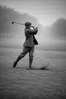Der Golfer befindet sich mitten im Schlag. Die Bewegung ist eingesetzt, die Erde löst sich kurz vom Boden, aber auch hier überwiegt die Beherrschung. Die Haltung bleibt stabil, der Körper im Gleichgewicht. Selbst in der Bewegung bleibt die Stille spürbar.