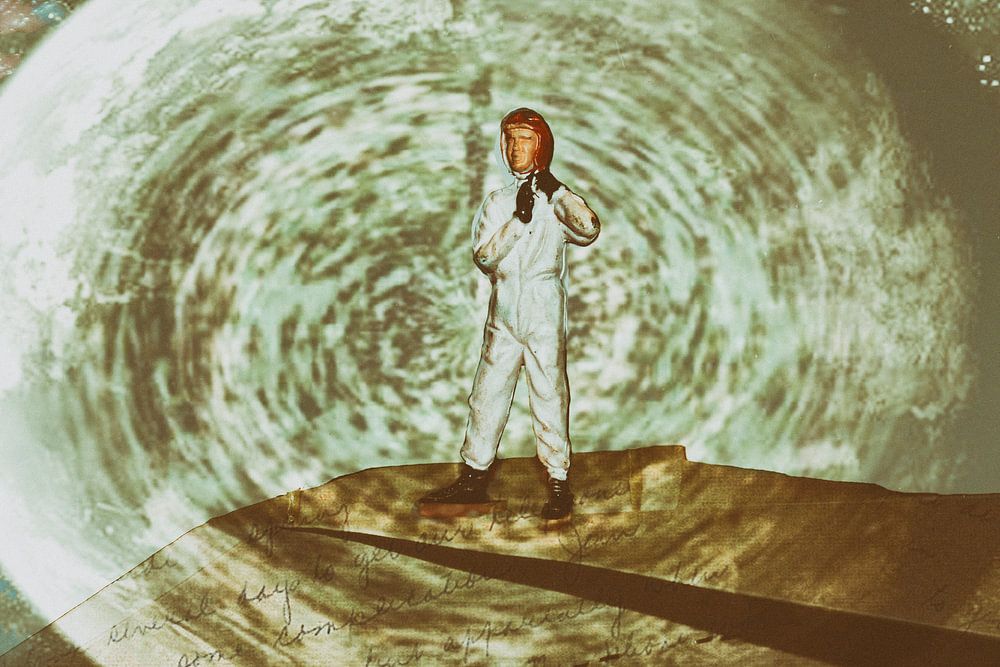 Fotografie von Miniaturmodellpuppen, Pilot. Papier Flugzeuge Düsenjäger Weltkugel die Erde