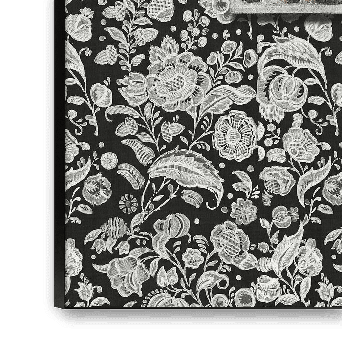 Dieses auffällige Kunstwerk kombiniert eine klassische figurative Szene mit einem kühnen, botanischen Dekorationsdesign.