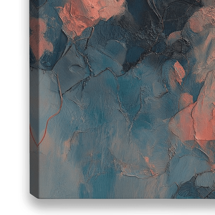Ein verträumtes, abstraktes Blumenkunstwerk mit zarten Blüten in Rot und Pfirsich, die sich über kühle blaue und schieferfarbene Texturen legen und Ruhe, Eleganz und ein Gefühl von sanfter Bewegung hervorrufen.