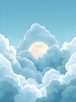 Lassen Sie sich mit diesem ätherischen Kunstdruck in einen Zustand der Ruhe versetzen. Er zeigt einen leuchtenden Vollmond, der sich gelassen in ein Meer aus weichen, bauschigen Wolken schmiegt. Die Farbpalette ist eine beruhigende Mischung aus pastellfarbenen Blautönen und klarem Weiß, die ein Gefühl der Ruhe und des Friedens…