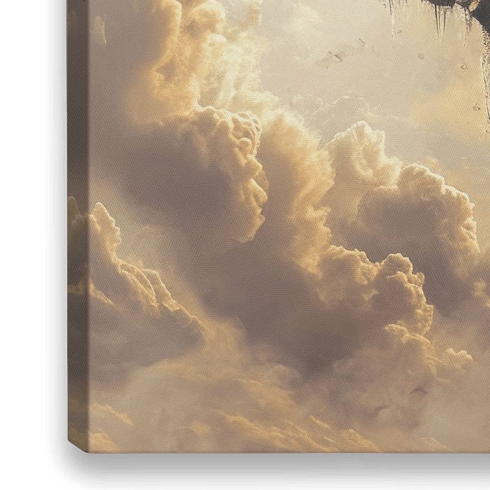 Dieses beeindruckende Bild zeigt einen Elefanten, der aus den Wolken aufzutauchen scheint, während im Hintergrund eine himmlische Szene zu sehen ist. Die Farben sind eine Mischung aus warmen goldenen und braunen Erdtönen, die im Kontrast zu den dunkleren und helleren Schattierungen der umgebenden Wolken stehen. Dieses kraftvolle Bild…