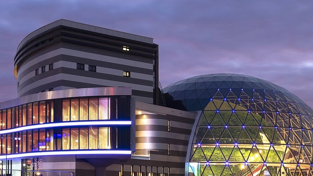 Das AFAS-Theater in Leusden in der blauen Stunde. Der Komplex, zu dem das Theater gehört, wurde von Just Architects aus Amstelveen entworfen.
