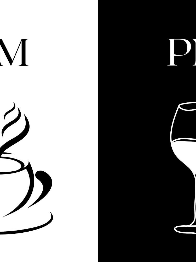 Unser Fine Art Print spielt mit Kontrasten: Links eine schwarze Kaffeetasse vor weißem Hintergrund mit dem Wort "AM", rechts ein weißes Weinglas vor schwarzem Hintergrund mit "PM". Perfekt für Kaffee- und Weinliebhaber, bringt dieser hochwertige Kunstdruck Stil und Humor in Ihre Küche oder Ihr Büro.