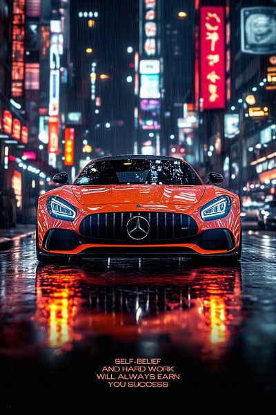 Ein leuchtend orangefarbener Mercedes-AMG GT strahlt inmitten einer regnerischen Stadtnacht. Umgeben von Neonreklamen im Stil Tokios erzeugen die Reflexionen auf dem nassen Asphalt eine futuristische, energiegeladene Cyberpunk-Ästhetik.