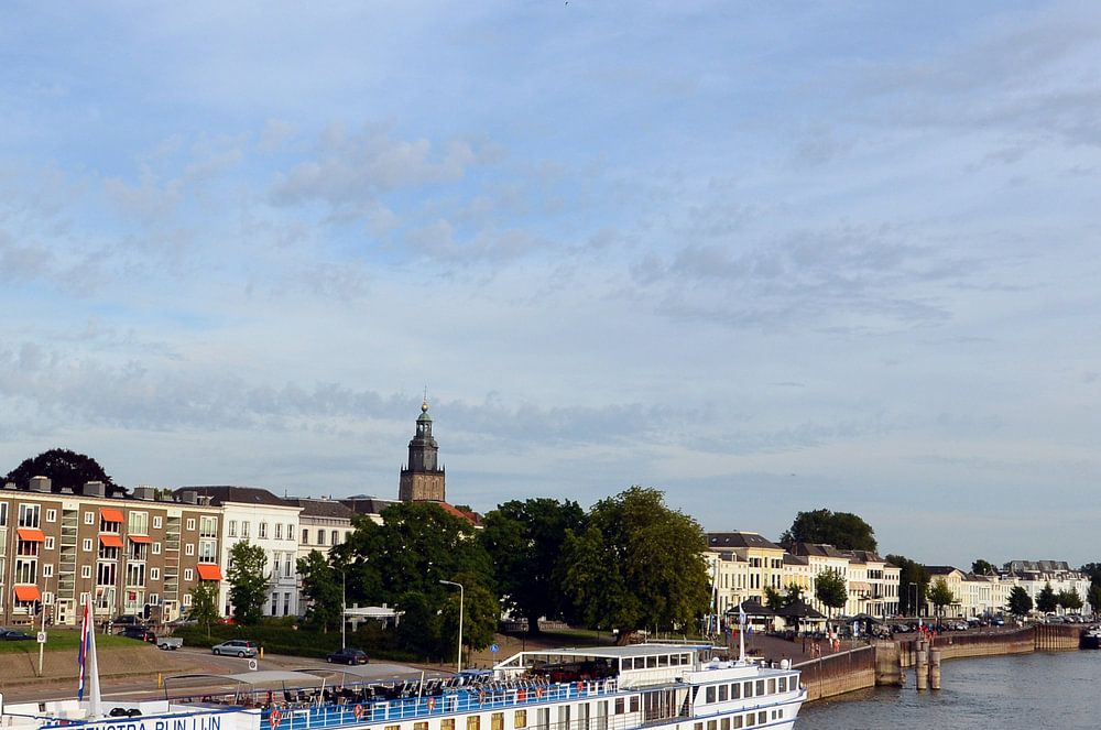 Het aanzicht van Zutphen boven de IJssel met een aangemeerd passagiersschip.