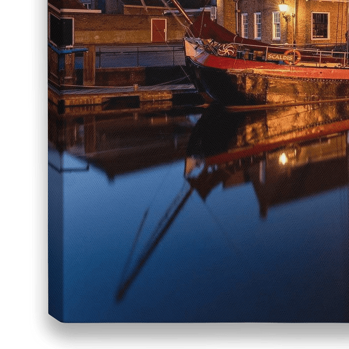 Zierikzee ist eine Gemeinde auf der Insel Schouwen-Duiveland in Zeeland. Hier sehen wir den Zuidhavenpoort und die Zugbrücke am Alten Hafen der Stadt, bei Nacht in der blauen Stunde.