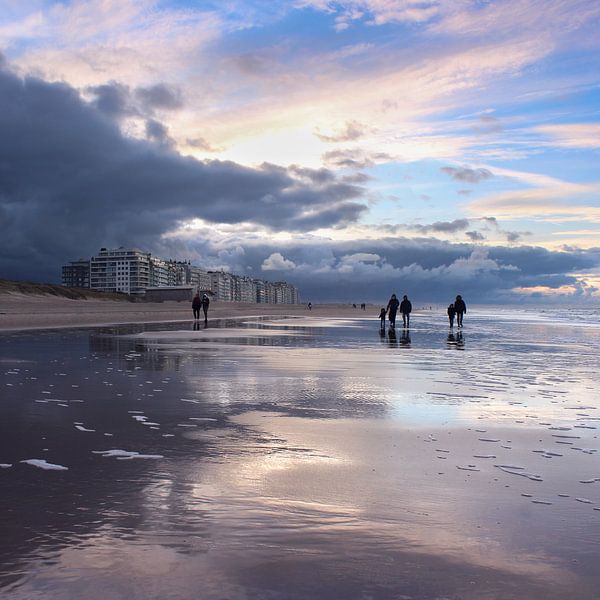 Wunderschönes Abendlicht, das sich im nassen Sand spiegelt, bei Sonnenuntergang am Strand von Wenduine, de Haan, in Westflandern an der Küste Belgiens. Sanfte Pastellfarben dominieren in dieser flämischen Küstenlandschaft.