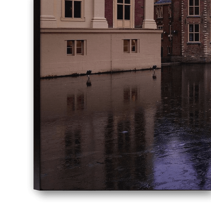 magischer Abendhimmel über Hofvijver, den Regierungsgebäuden und dem Mauritshuis in Den Haag