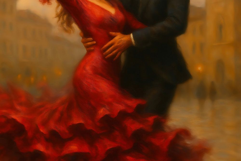 In einer nebligen Altstadt, eingehüllt in den warmen Schein der Straßenlaternen, verlieren sich zwei Tänzerinnen in einem intensiven Flamenco. Ihr feuerrotes Kleid schwingt wie eine Flamme, während sich ihre Blicke in einem Moment der reinen Hingabe finden. Diese romantische Szene strahlt Leidenschaft, Eleganz und Melancholie aus - eine Ode an die Kraft des Tanzes als universelle Sprache des Herzens.