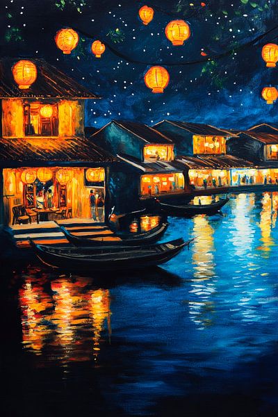 Ein träumerisches Szenario entfaltet sich mit golden leuchtenden Laternen, die sanft über einem ruhigen Gewässer schimmern. Die warmen Lichter der Häuser spiegeln sich malerisch im Wasser und erzeugen eine zauberhafte Atmosphäre. Ideal für ein Wohnzimmer, um entspannende Abende voller Kreativität und Inspiration zu fördern.
