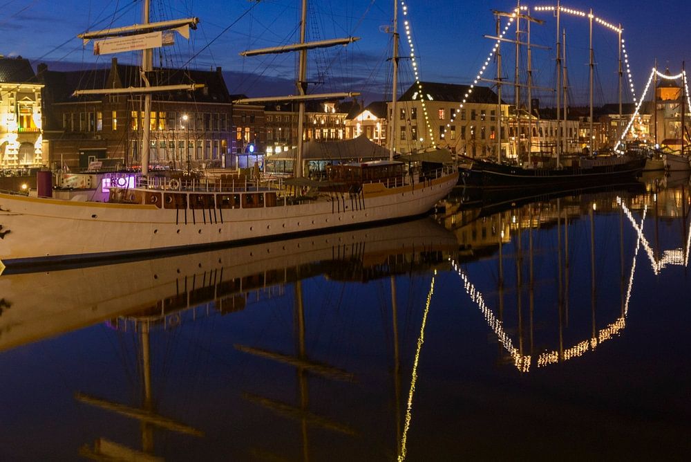 Abendstimmung in der Skyline der Stadt Kampen in Overijssel, Niederlande. Die Lichter der Stadt spiegeln sich im ruhigen Wasser, während der Himmel kurz nach Sonnenuntergang blau geworden ist.