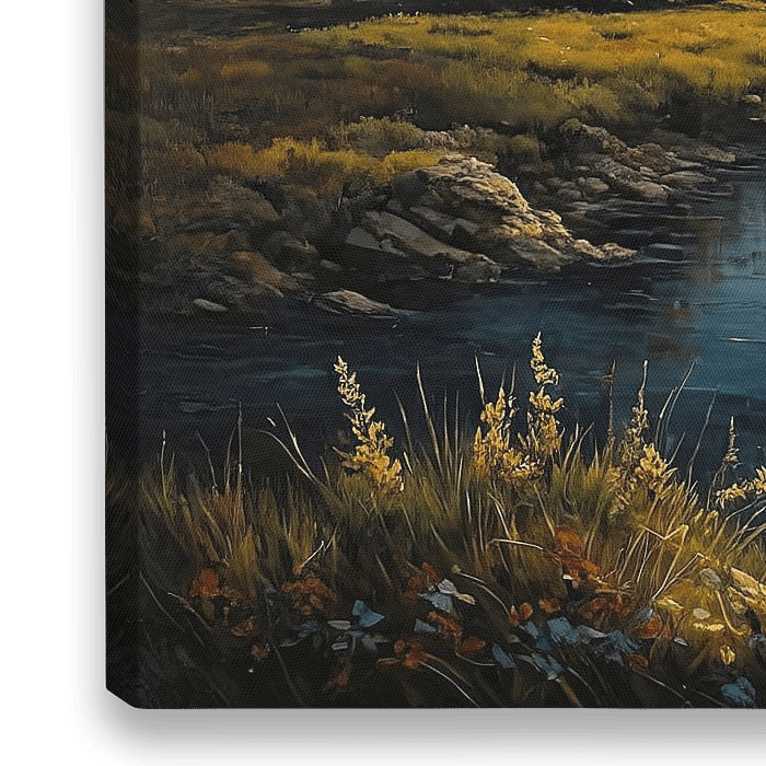 In warmes Gold getaucht, spiegelt ein ruhiger Fluss die untergehende Sonne wider. Sanfte Wellen ziehen sich über die Wasseroberfläche, während Ufergräser und herbstlich gefärbte Sträucher im Vordergrund im letzten Licht des Tages leuchten. Im Hintergrund erheben sich sanfte Hügel und ein majestätischer, schneebedeckter Berg, dessen…