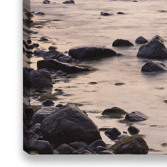 Große Steine am Ostseestrand im Abendlicht zum Sonnenuntergang mit einem roten Streifen am Himmel, Wasserbewegung in Langzeitbelichtung - Location: Deutschland, Ostsee, Insel Rügen, Göhren