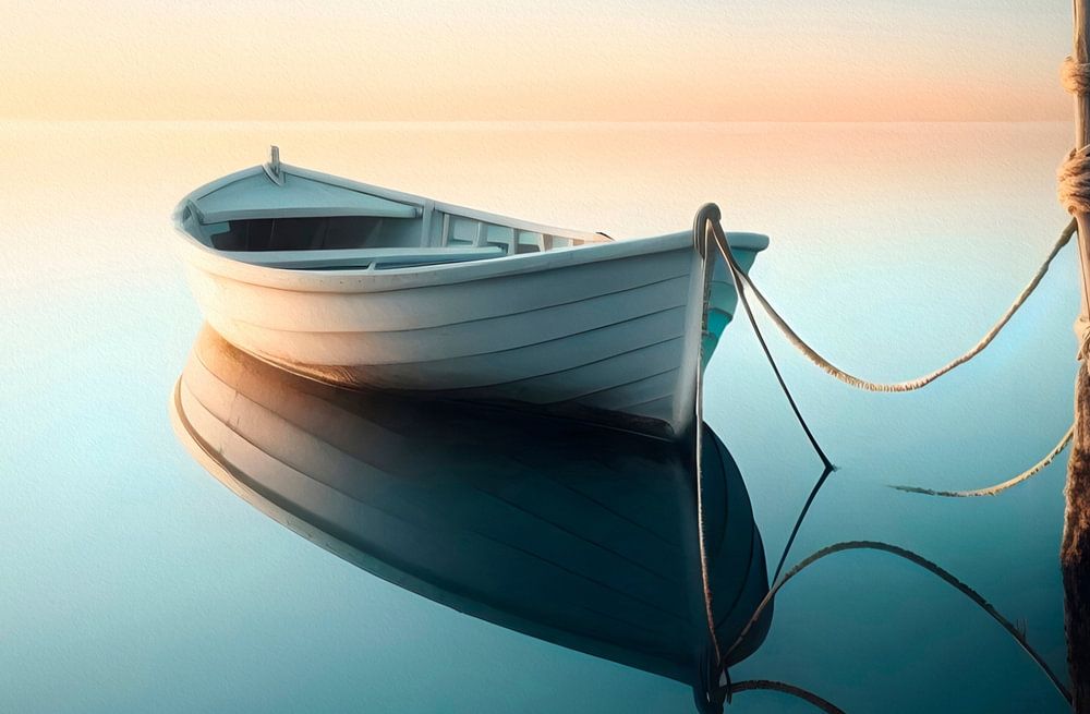 Ein kleines helles Ruderboot ist an einem Holzpfahl mit Seilen befestigt und liegt ruhig auf spiegelglattem Wasser. Die sanften Farbverläufe von Türkisblau bis zu warmem Sonnenuntergangs-Orange schaffen eine harmonische, meditative Atmosphäre.