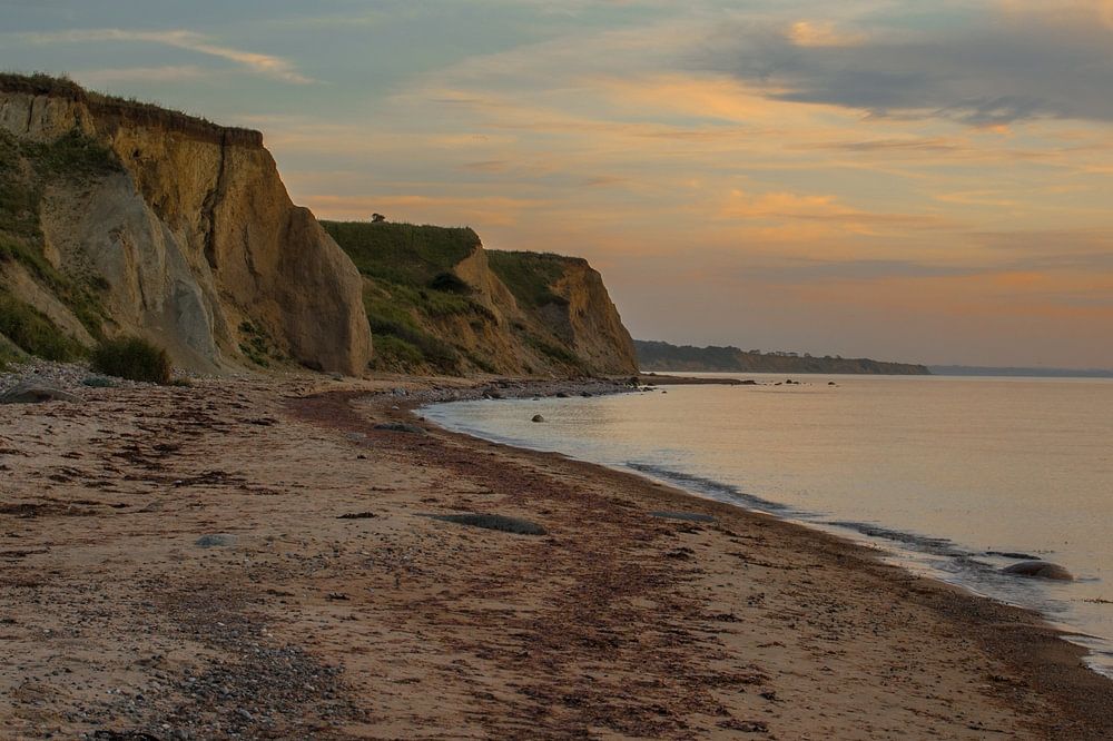 Dieses stimmungsvolle Landschaftsfoto fängt die friedvolle Atmosphäre der Steilküste von Heiligenhafen in den sanften Farben des Sonnenuntergangs ein. Warmes Licht taucht die grasbewachsenen Klippen und den goldenen Sandstrand in ein malerisches Farbenspiel aus Orange, Blau und sanften Erdtönen. Die ruhige Ostsee spiegelt das Abendlicht wider, während sich die Küstenlinie harmonisch in die Ferne zieht.