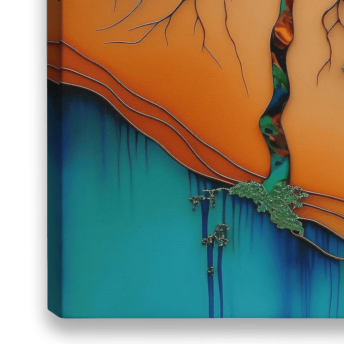 Umgeben von schönen Farben wie Grün, Blau und Gelb/Orange und Beigetönen steht dieser abstrakte Baum, dessen skurrile Linien seine Form unterstreichen. Eine mit Tusche, Farbe und Alkoholtechniken digital "gemalte" Bearbeitung