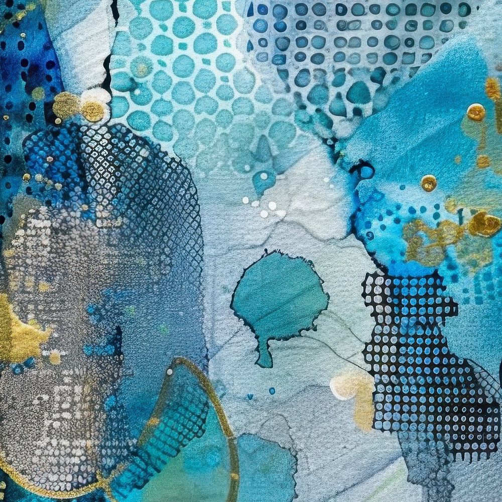 Abstraktes Gemälde mit hauptsächlich blauen, weißen und goldenen Farbtönen. Schöne Textur und Muster. In den Farben des Urlaubs und der schönsten griechischen Inseln, blau und weiß. Der Schwerpunkt liegt auf visuellen Elementen wie Farben, Formen und Texturen und lässt Raum für persönliche Interpretationen. Dieses Kunstwerk würde aufgrund seines abstrakten Charakters und der Verwendung von kühnen grafischen Elementen gut in einen modernen oder zeitgenössischen Wohnstil passen.