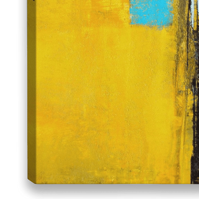 abstraktes, leuchtendes Bild in Gelb, kontrastreich, Türkis, Schwarz, Weiß, Gelbtöne, moderne Malerei, farbenfroh, leuchtend, dekoratives Bild für Büro, Hotel, Praxis oder Wohnräumen, zeitgenössische Malerei in Acryl