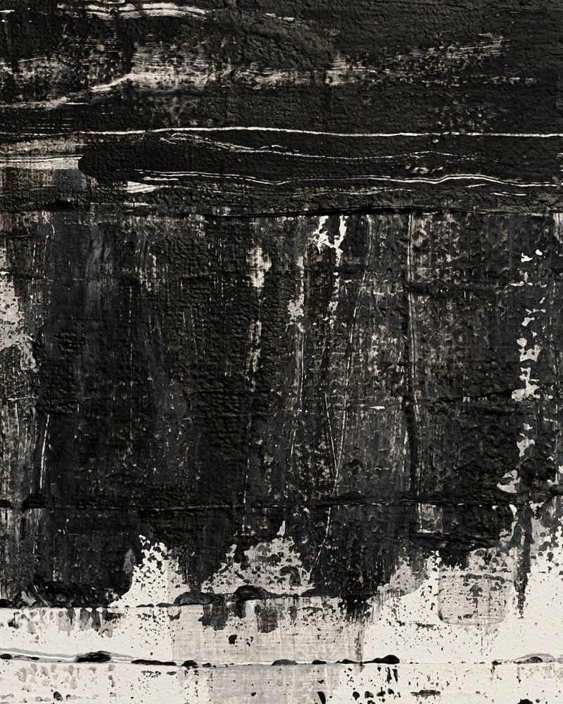 Ein zeitloses abstraktes Gemälde in Schwarz-, Weiß- und Grautönen. Bei dieser Arbeit wurde besonders auf die Verwendung von Material, Textur und Linienkomposition geachtet.