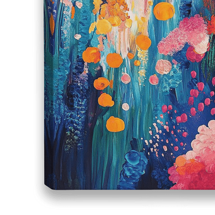 Ein lebhaftes und farbenfrohes abstraktes Gemälde eines Unterwassergartens mit Korallenriffen in Orange-, Rosa-, Blau-, Grün-, Gelb- und Violetttönen und Meerespflanzen, die wie Blumen im Wasser schwimmen. Der Hintergrund ist ein Farbverlauf von hell nach dunkel, der Tiefe erzeugt. Dieses Kunstwerk eignet sich hervorragend für die Heimdekoration oder als Wandkunst. Es ist mit dicken Pinselstrichen und Acrylfarbe gemalt.