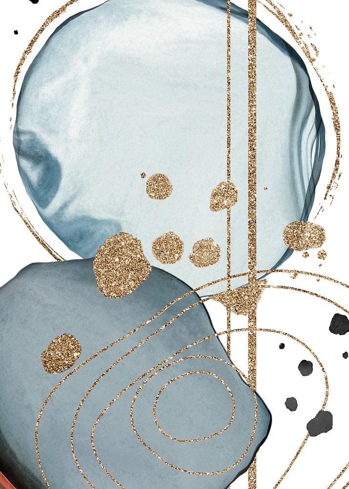 Modernes, abstraktes und minimalistisches Kunstwerk mit handgemalten Aquarellformen und -linien in blauen und goldenen Farben.