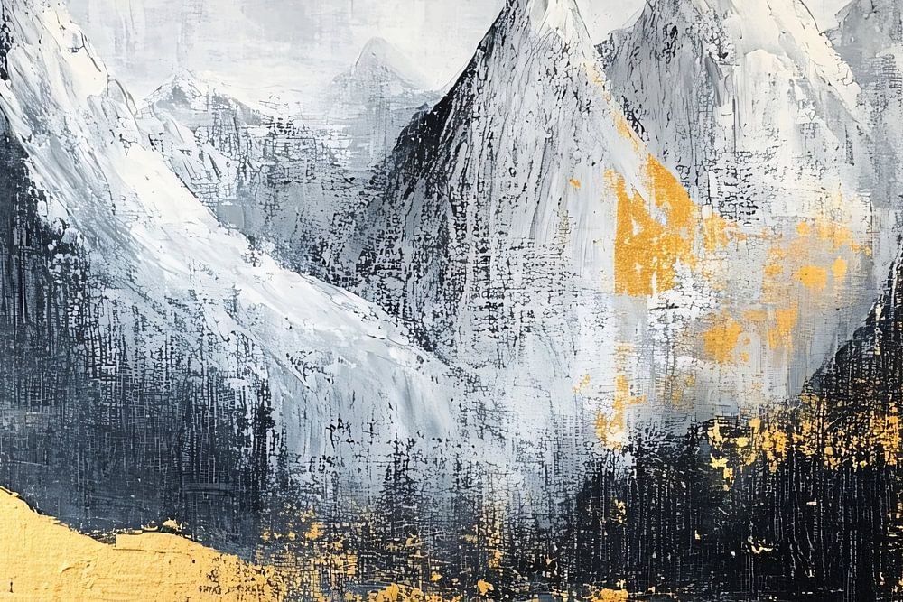 Dieses abstrakte Kunstwerk verbindet die Kraft und Pracht der Berge mit der warmen Eleganz von Goldakzenten. Die Berggipfel, die in verschiedenen Grautönen dargestellt sind, vermitteln ein Gefühl von Kühle und Gelassenheit, während die leuchtenden Goldtöne die Szene mit einem Gefühl von Luxus und Wärme bereichern. Das Wechselspiel zwischen Hell und Dunkel, zwischen kühlen und warmen Farben macht dieses Gemälde zu einer beeindruckenden Bereicherung für jeden Raum. Es ist ideal für Liebhaber moderner Kunst und schafft ein Gleichgewicht zwischen Abstraktion und Vertrautheit. Das Gemälde kann ein inspirierender Mittelpunkt in einem Wohnzimmer, Büro oder einem anderen Raum sein, in dem ein Hauch von Natur und Raffinesse erwünscht ist.