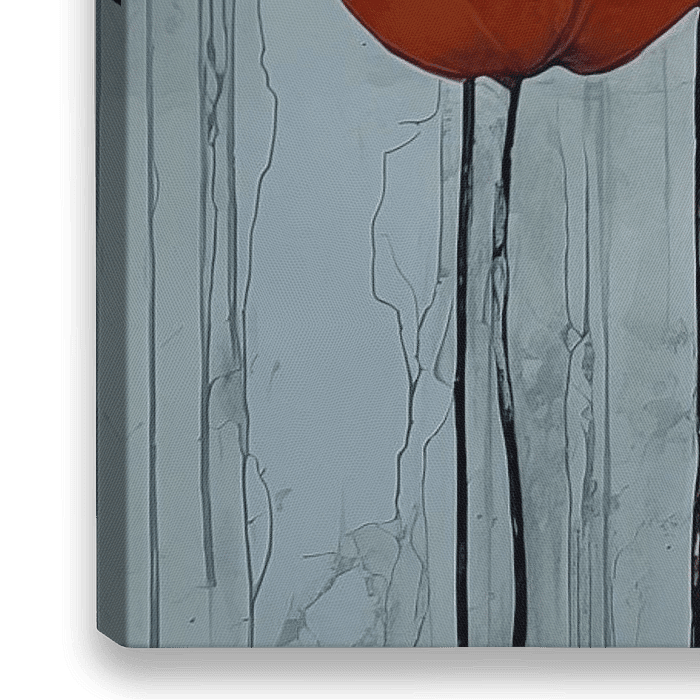 Abstrakte Blumen blühen auf langen, geheimnisvollen schwarzen Stängeln, die sich wie Silhouetten vor einem Hintergrund aus zartem Weiß und subtiler grauer Leinwand abzeichnen. Die Komposition strahlt ein Gefühl von Eleganz und Subtilität aus, wobei der Künstler mit den Kontrasten zwischen der tiefen Dunkelheit der Stängel und dem…