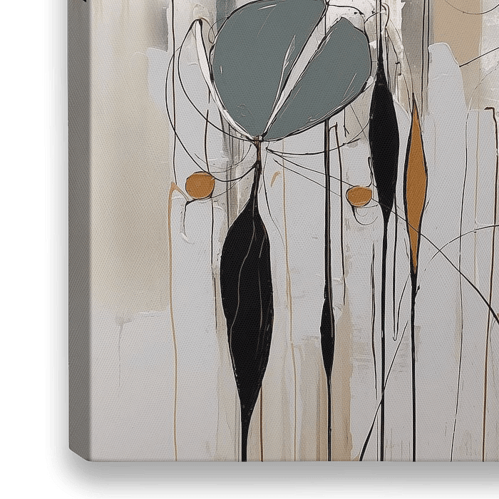 Abstrakte Blumen blühen auf langen, geheimnisvollen schwarzen Stängeln, die sich wie Silhouetten vor einem Hintergrund aus zartem Weiß und subtiler grauer Leinwand abzeichnen. Die Komposition strahlt ein Gefühl von Eleganz und Subtilität aus, wobei der Künstler mit den Kontrasten zwischen der tiefen Dunkelheit der Stängel und dem…