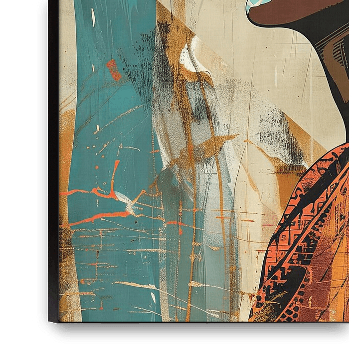 In dieser abstrakten Kunst wird das Profil einer afrikanischen Frau in kräftigen, lebendigen Farben und geometrischen Formen dargestellt. Der kunstvoll gebundene Kopfschmuck und die eleganten Accessoires verleihen der Silhouette eine besondere Tiefe und Ausdruckskraft. Die Kombination aus traditioneller afrikanischer Ästhetik und…