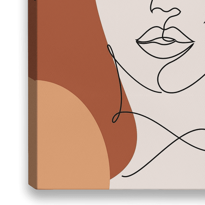 Moderne Linienzeichnung mit dem Gesicht einer Frau, Blumen und abstrakten Formen in Terrakotta-Farben. Diese spezielle Ein-Linien-Zeichnung wird mit einer Linie gezeichnet.