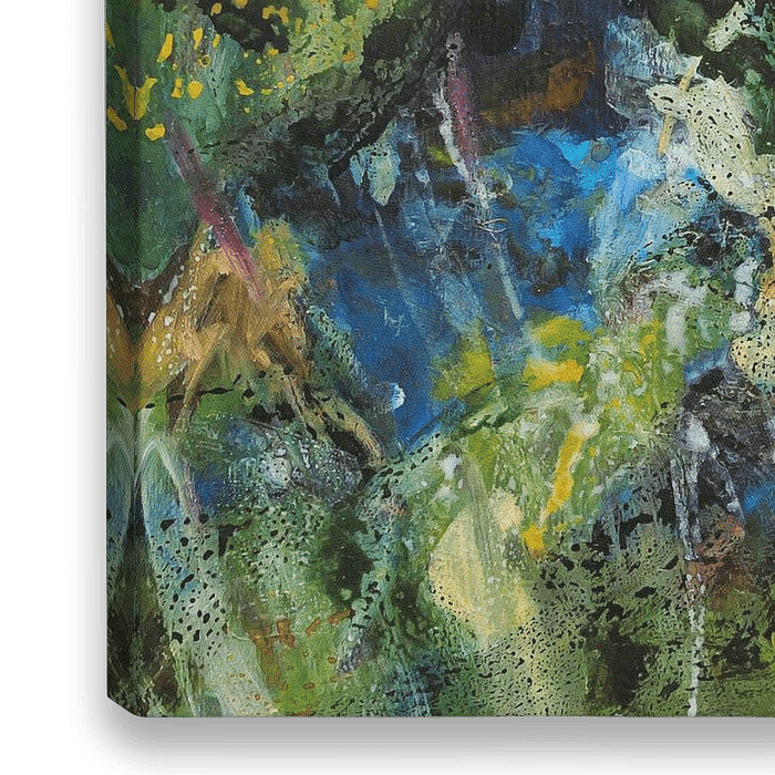 Mehrfarbige, überwiegend grüne abstrakte Malerei. Das Werk zeichnet sich durch Tiefe, organische Muster und eine natürliche, dunkle Atmosphäre aus.