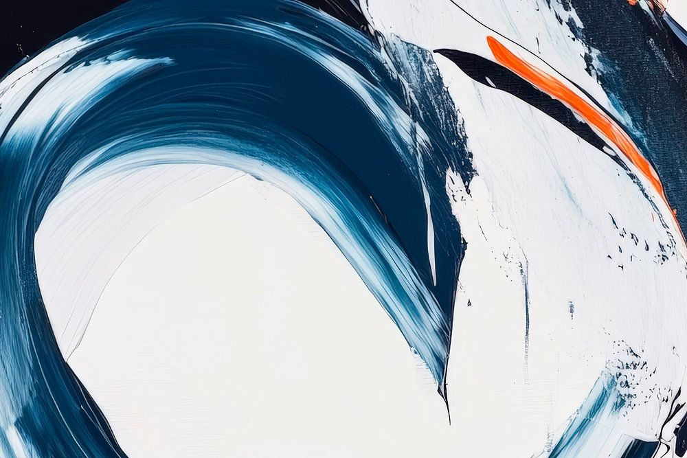 Mit lebhaften Pinselstrichen tanzen kräftige Blautöne und dynamische orange Akzente über den klaren Hintergrund. Die energische Komposition vermittelt ein Gefühl von Bewegung und Kreativität, ideal für ein Wohnzimmer oder ein kreatives Arbeitszimmer. Dieses Kunstwerk wird zum Blickfang, das Gespräche anregt und Inspiration entfaltet.