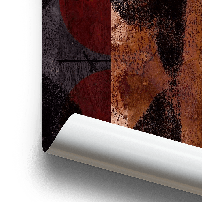 Moderne abstrakte Mixed Media Art Collage aus Drucken, Texturen, geometrischen Formen in warmer, retro inspirierter Farbpalette. Kunstwerkserie für Retro, Industrial, Design, eklektischen, böhmischen Wohnstil.