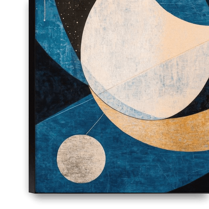 In einer harmonischen Beziehung aus klaren Kreisen und dynamischen Linien entfaltet sich eine kosmische Symphonie. Die goldenen Akzente schimmern vor einem tiefblauen Hintergrund, während die sanften Formen den Raum mit einer beruhigenden Eleganz erfüllen. Ideal für ein modernes Wohnzimmer, bringt dieses Kunstwerk einen Hauch von Weite…