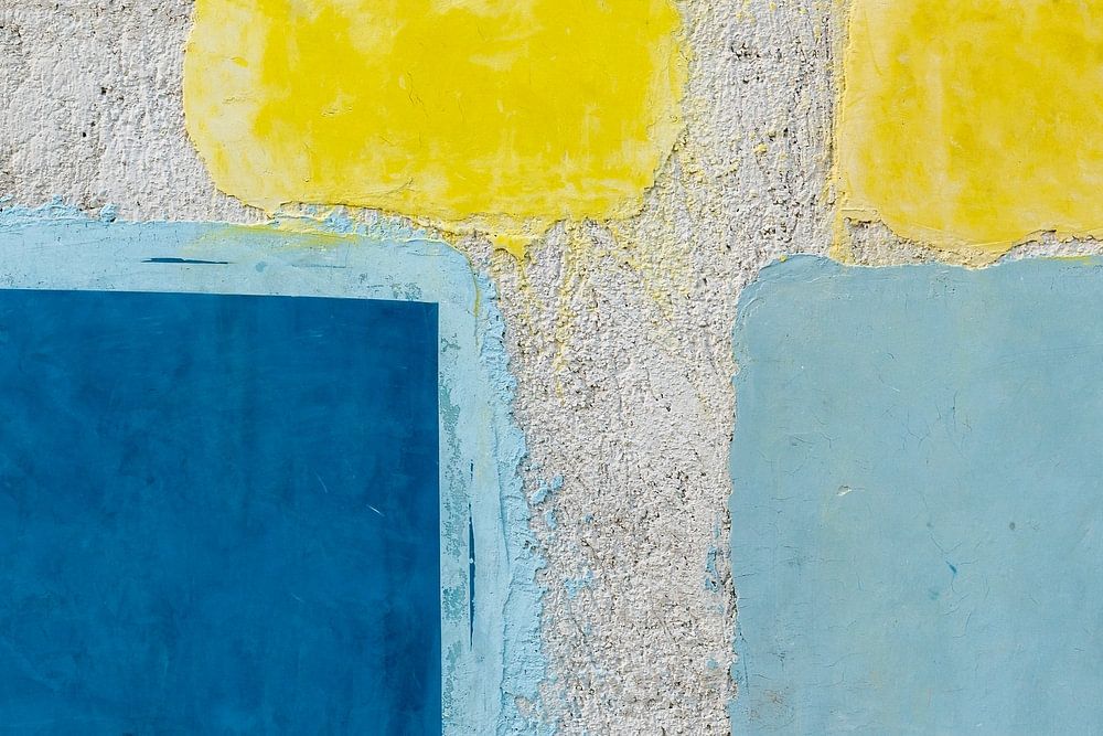 Ein Foto von einer Wand mit abstrakten blauen und gelben geometrischen Formen. Dieses Foto wurde in Mexiko aufgenommen, wo es viele bunte Wände gibt.