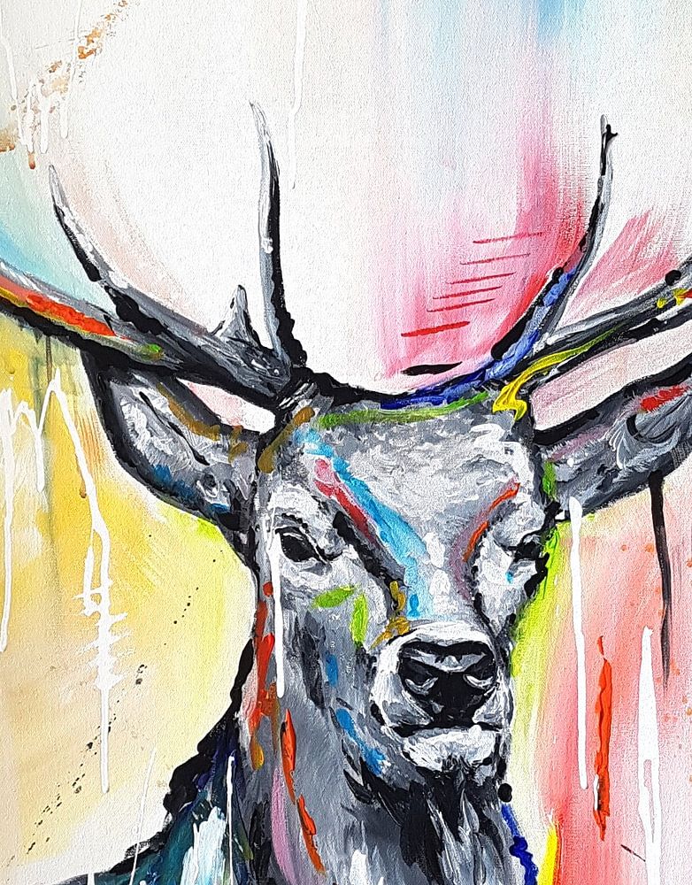 Geweih und verschiedene Malstile. Großer Hirsch in wilder Waldnatur. Magst du Tiere, dann wird diese schöne moderne abstrakte Arbeit in deinem Zimmer fantastisch sein
