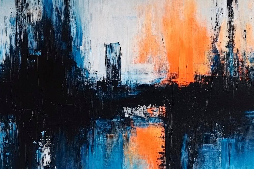 In lebendigen Blautönen schwebt eine dynamische Komposition, in der feurige Orangen und tiefes Schwarz eine spannende Energie erzeugen. Die abstrakte Darstellung erinnert an einen mystischen Hafen in der Dämmerung, was ihr eine anziehende Tiefe verleiht. Ideal für das Wohnzimmer, wo sie Gespräche anregen und eine einladende Atmosphäre schaffen kann.