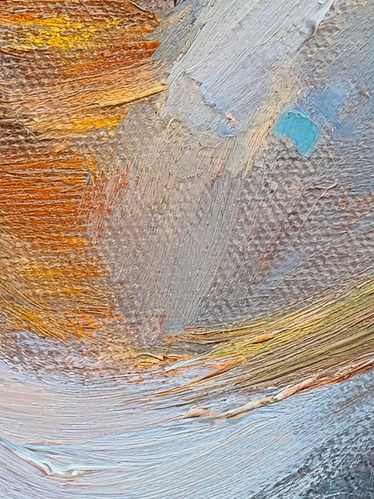 Abstraktes Gemälde mit warmen Gold- und Graublautönen.