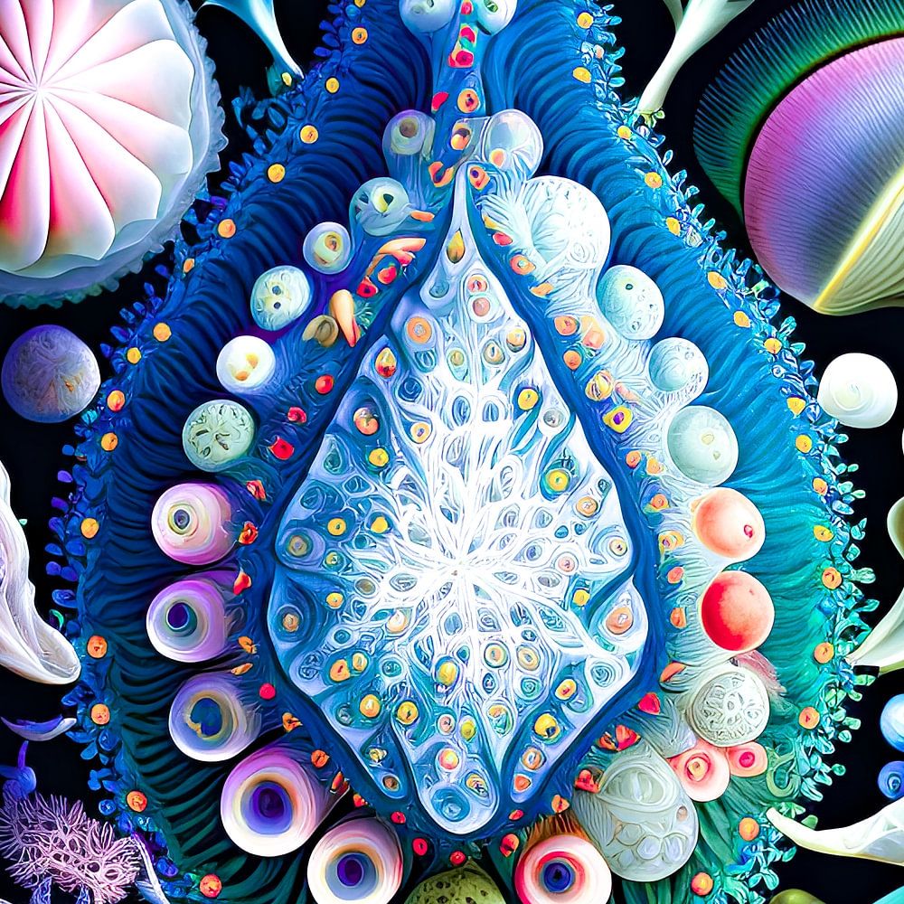 Dieser Kunstdruck zeigt: Natur, Organismen, die Unterwasserwelt, Fantasie und Vorstellungskraft, das Leben im Meer, ist blau und dunkel in der Farbe, hat ein quadratisches Format, ist abstrakte Kunst und dekorativ.