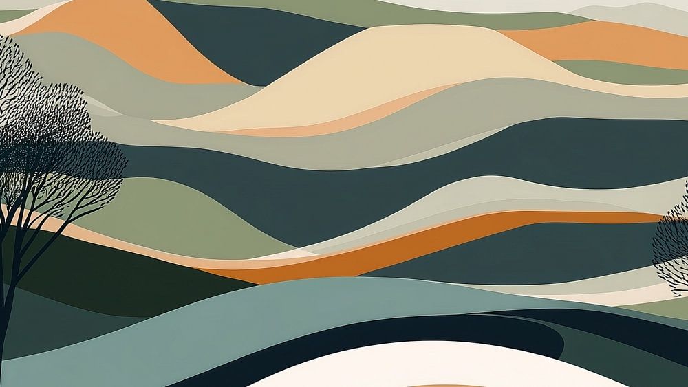 Die Blautöne vermitteln ein Gefühl der Ruhe und Tiefe, während die warmen orangefarbenen Akzente dem Bild Energie und Wärme verleihen. Das Schwarz schafft einen starken Kontrast und hebt die fließenden Linien und organischen Formen der Bäume und Hügel hervor. Das Ergebnis ist eine moderne und ausdrucksstarke Darstellung der Landschaft, die die Natur auf abstrakte Weise zelebriert.