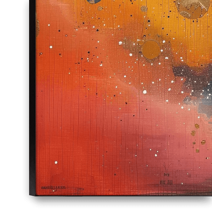 Abstraktes Gemälde | Schwebende Lichtkugeln - Dieses abstrakte Gemälde präsentiert eine Reihe von lebendigen und faszinierenden Farben, die sich über die Leinwand verteilen. Der Hintergrund bildet eine grobe Struktur, die von natürlichem Beige auf der rechten Seite bis zu intensiven Farben wie Orange, Rot, Blau und einem Hauch von Grün…