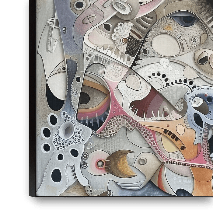 Abstraktes Gemälde | Verwobene Natur und Maschine - Dieses abstrakte Gemälde ist eine reiche, organische Verschmelzung mechanischer und biologischer Formen, die zu einer nahtlosen, zarten Komposition verwoben sind. Die Künstlerin verwendet eine gedämpfte und doch lebendige Farbpalette, die Grautöne, Beigetöne, Blautöne, Rottöne und…