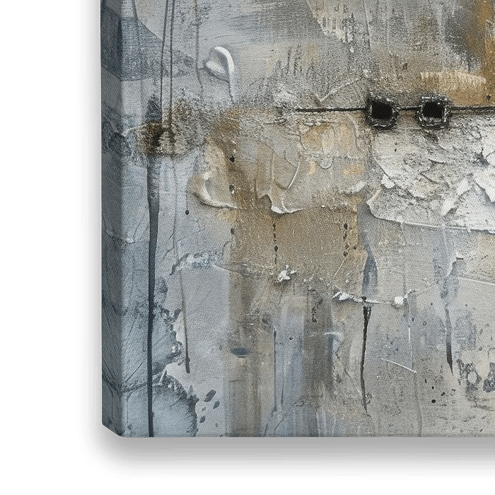 Abstraktes Gemälde mit einer Mischung aus neutralen Tönen wie Grau, Weiß und Schwarz, mit Akzenten in Rot und Orange. Das Gemälde strahlt durch seine neutralen Töne und Formen Ruhe aus. Durch die Texturen und die subtilen Farben ist es ein schöner Blickfang in einer Einrichtung. Es passt gut in einen modernen oder minimalistischen Wohnstil.